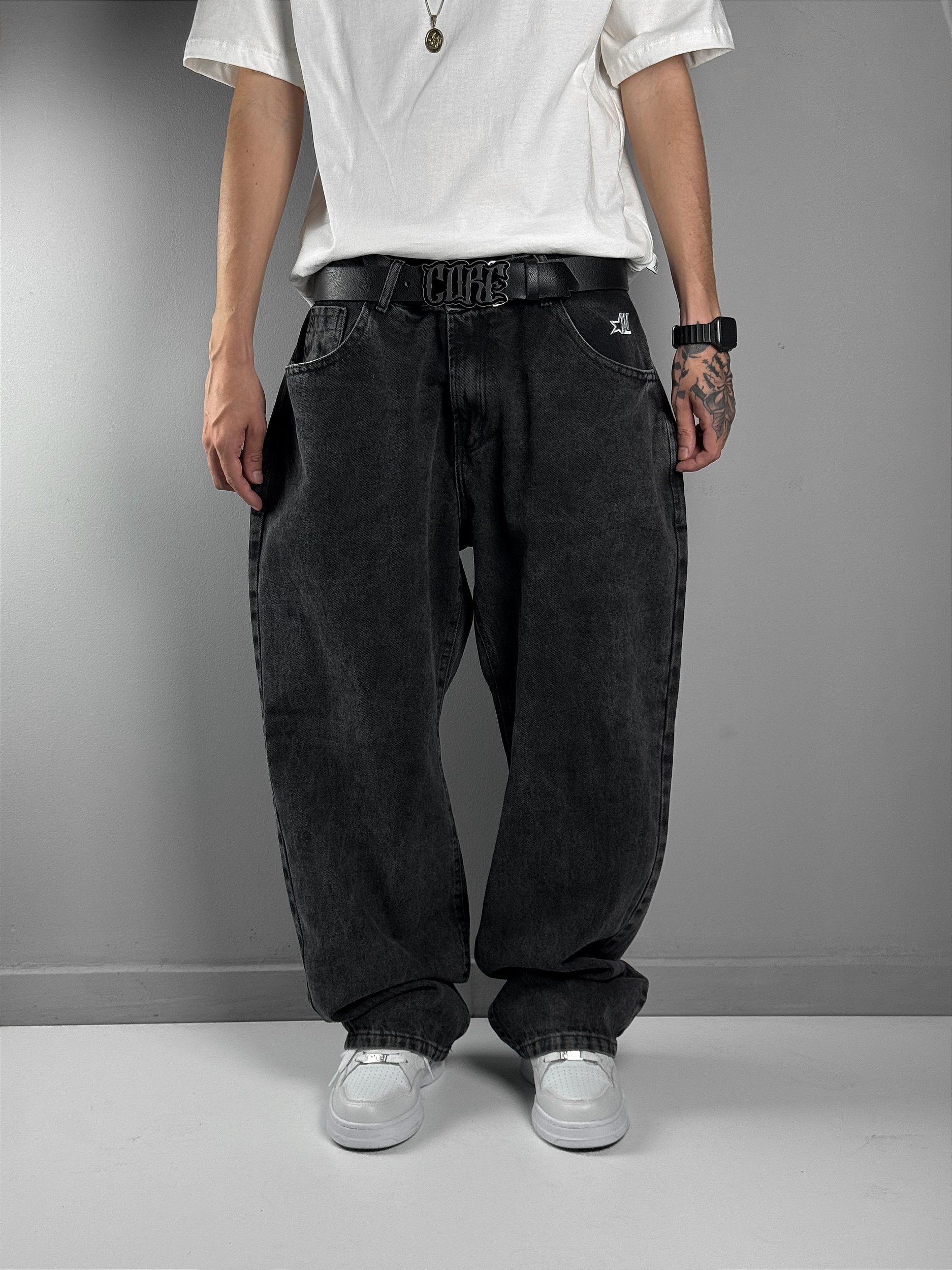 CALÇA JEANS BAGGY NEW LIFE EMBROIDERY STAR BLACK, o modelo perfeito que combina estilo e conforto! Com um corte reto e balão oversized, essa calça é ideal para quem busca o visual autêntico do Streetwear.
